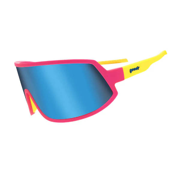 Blast off into adventure with MY OTHER RIDE IS A JET PACK, limited-edition wraparound sunnies with magenta and yellow frames and a teal lens. Perfect for thrill seekers who soar to new heights, while somehow not burning their butts off. Respect.
