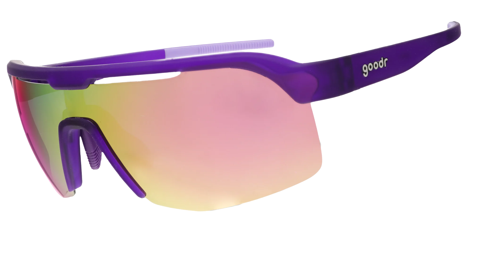 TAG, you're IT in these purple shield sunglasses w/ half-rim frames & light pink reflective lenses. Channel your inner cephalopod's athletic abilities in these baddies. (Get real, does having eight arms give you an unfair advantage when playing tag?)