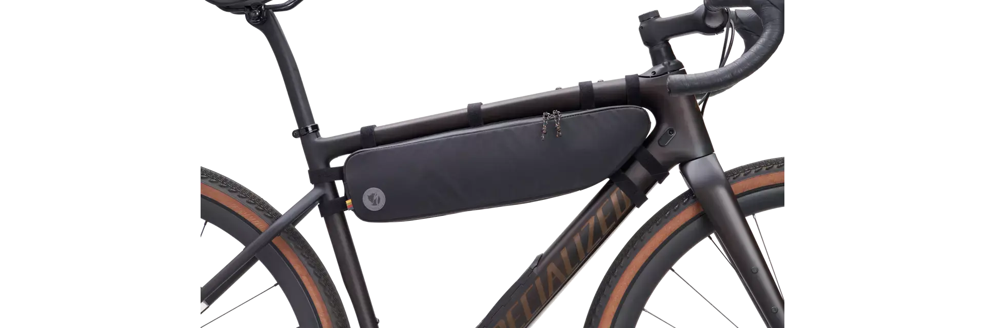 Two-way zippered frame bag with a large opening for easy access to biking essentials. It has a sturdy, reliable seven-point Velcro attachment, and the pack is made from durable Vinylon with a recycled nylon lining and foam-padded sides that help maintain its shape. Inside mesh pockets keep track of smaller items. Seams are not taped, but the lining is waterproof. Part of the Specialized/Fjällräven series for urban rides and bikepacking adventures.